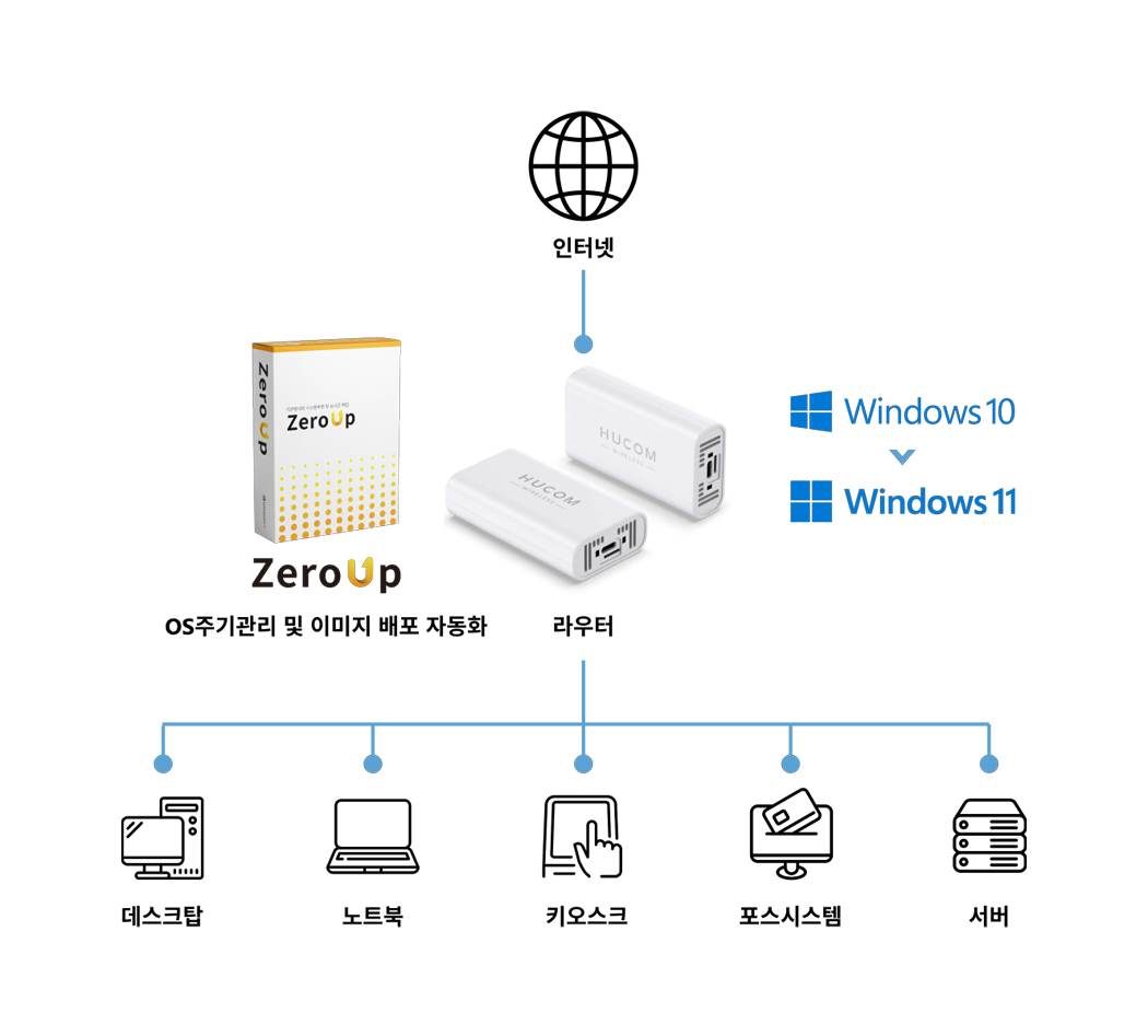 제로업을 이용한 Windows OS업그레이드,보안업데이트,데이터백업을 자유롭게 할 수 있습니다. 데스크톱, 노트북, 키오스크, 포스 시스템, 서버 등 무선 라우터가 필요한 기기라면 모두 손쉽게 이용할 수 있습니다.
